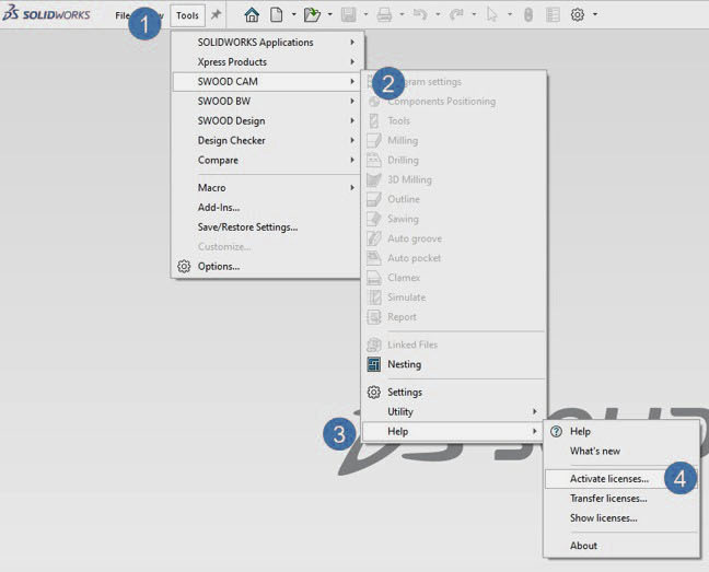 Tools > SWOOD CAM/Design > Help > Activate Licences.