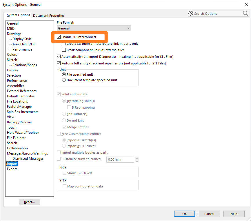 By default, 3DInterconnect is turned on. But it can be toggled on and off via the System Options > Import menu. Additionally, the imported geometry remains linked, so any changes made to it on the original CAD system can instantly update the geometry seen in SOLIDWORKS. This link can be broken, if you wish to block any unintentional updates caused to the model outside of SOLIDWORKS.