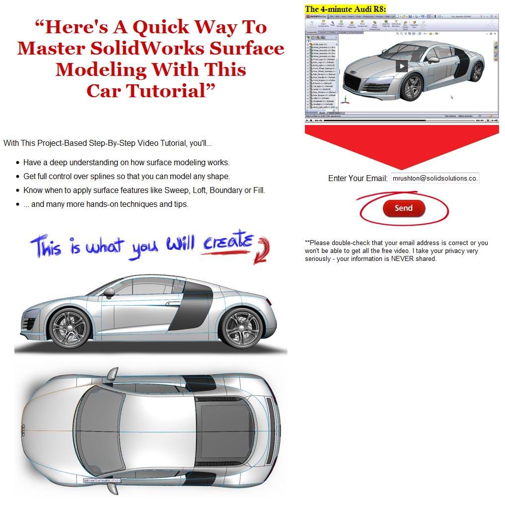 http://www.SOLIDWORKSaudir8.com/ for a step by step tutorial on how to model an Audi R8 in SOLIDWORKS. There is a sped up video online which shows how it is done...