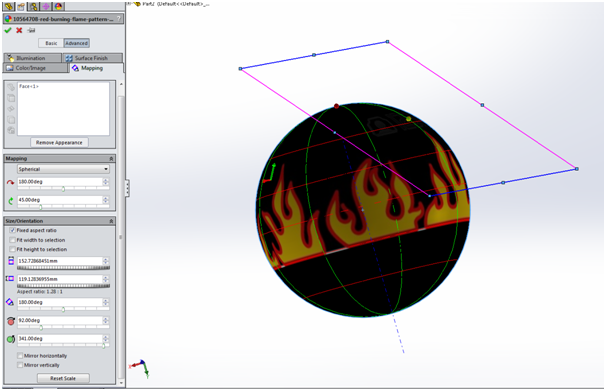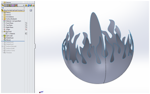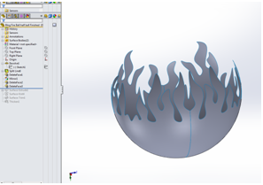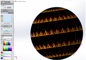 The flame pattern was saved as a JPEG file, a plain appearance was then added to the spherical face of the component. It is important that the appearance is added to the face and not the part or feature, this is for clarity later on when we position the pattern.