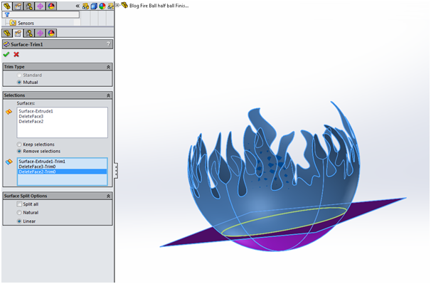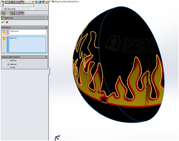 With our shape traced out we will use the sketch line to split the spherical face. To do this we employed the ‘split face’ command selecting the intersect option and using our 3D sketch as the splitting body.