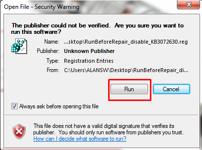 3. Double click on the file “RunBeforeRepair_disable_KB3072630.reg"