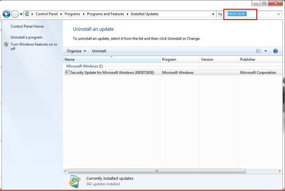 the application installs successfully, we can re-enable the Windows update KB3072630