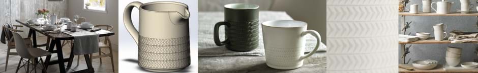 Back to the drawing board……….or in this case Solidworks. Recreating the hand thrown forms in the software, Denby was able to use Solidworks not only to rebuild and refine the shapes but also to mirror the 60’s technique of hand applied texture. The original handles, which had been created by extruding clay through a narrow section and hand applying to the pots was lovingly recreated, using the loft feature built into the software gave the design team full control of both the handles and spouts. Denby have found the combination of surface and solid functionality especially useful where softer more organic shapes are required. Working around the rims of the hollowware items…………jugs, mugs and teacups for example is a common design detail that requires a sensitive touch and several variations of the finished pots could be seen quickly within the programme before committing to a costly final design.